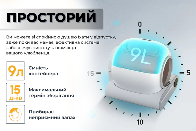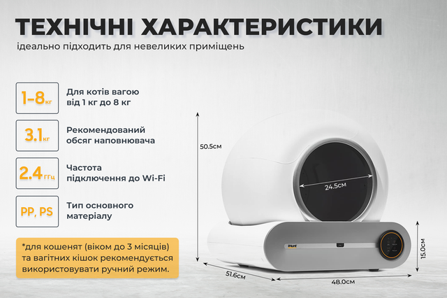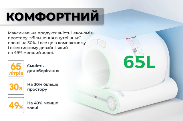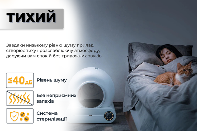 Що мені сподобалося – лоток реально прибирає сам, мені взагалі не треба про це думати. Просто раз на кілька днів викидаю контейнер з відходами, і все. Запаху в квартирі немає взагалі, це дуже відчутно. Ще великий плюс – працює тихо, нічого не гуркотить, не скрипить, кіт не боїться.