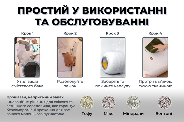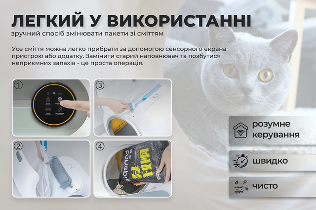 Лоток справді працює так, як обіцяли. Кіт звик за день, запаху немає, прибирати руками не треба. Єдине – контейнер для відходів хотілося б трохи більший, бо якщо забуваєш його вчасно викинути, може переповнитися.