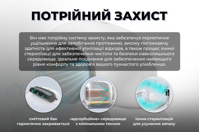 Лоток оснащений сенсорами присутності, що запобігають запуску очищення, коли кішка знаходиться всередині. Функція антиблокування гарантує стабільну роботу навіть при тривалому використанні.