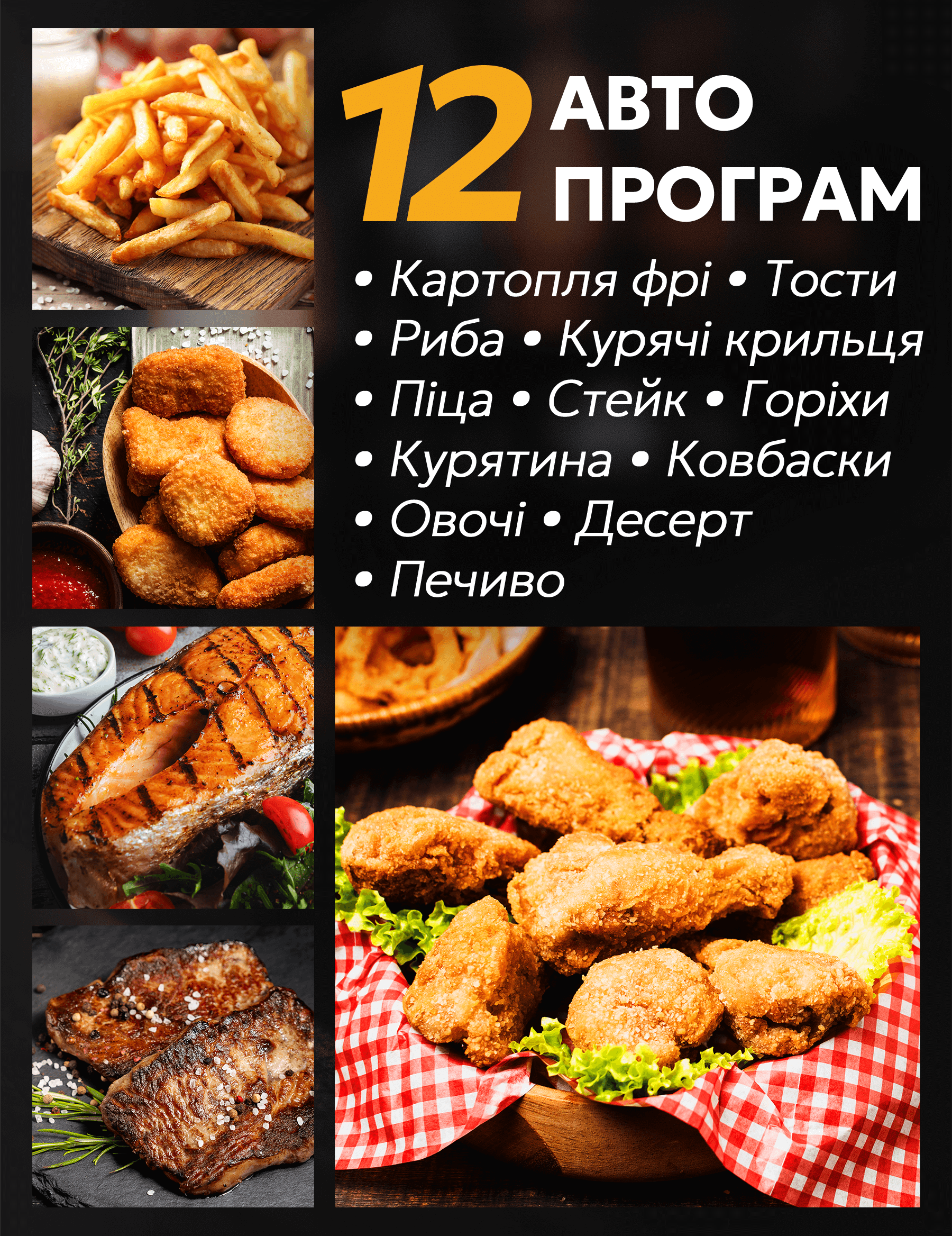 12 автоматичних програм - розігрівання, картопля фрі, стейки, риба, креветки, піца, курка, торт, барбекю, сушіння