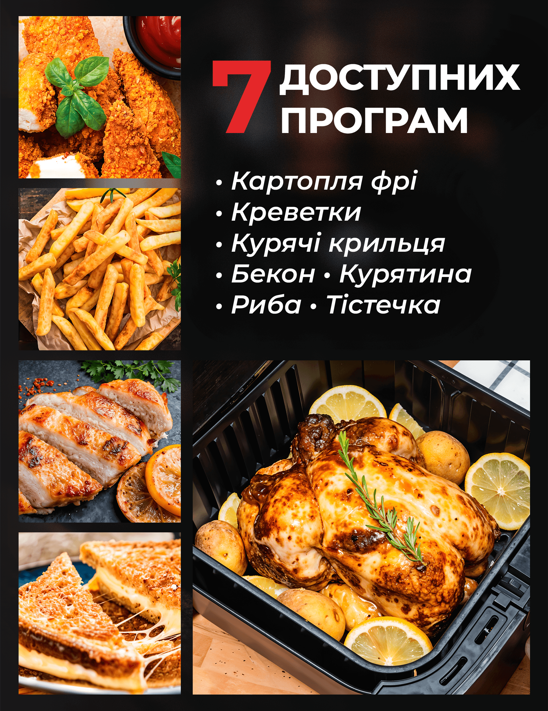 7 автоматичних програм. Оберіть оптимальний режим для картоплі фрі, курячих крилець, овочів, риби чи десертів.