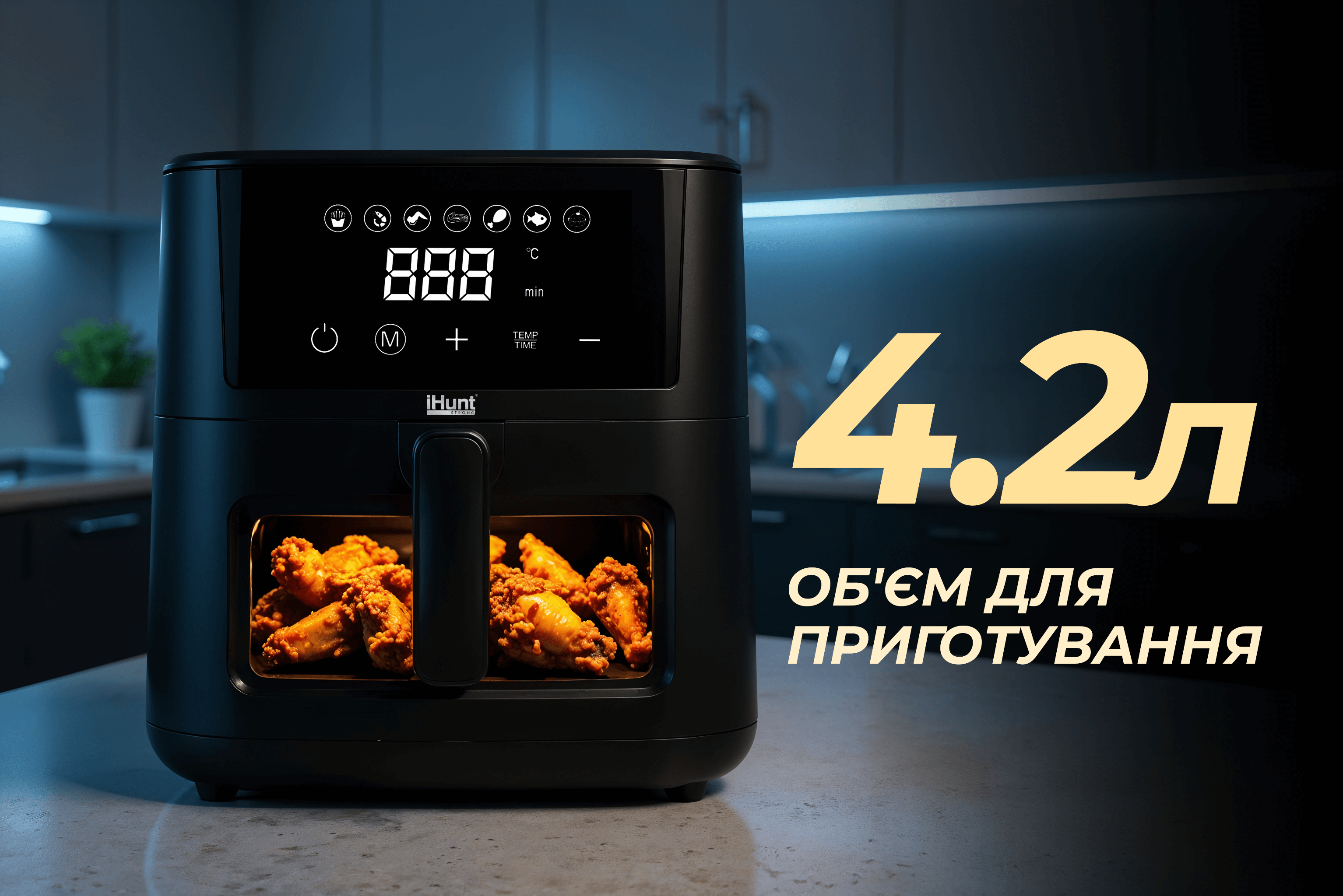 Аерофритюрниця iHunt Bro Air Fryer Ultra 4.2L — це сучасне рішення для здорового харчування. Завдяки технології циркуляції гарячого повітря ви отримуєте хрустку скоринку зовні та ніжну текстуру всередині — без зайвого жиру.