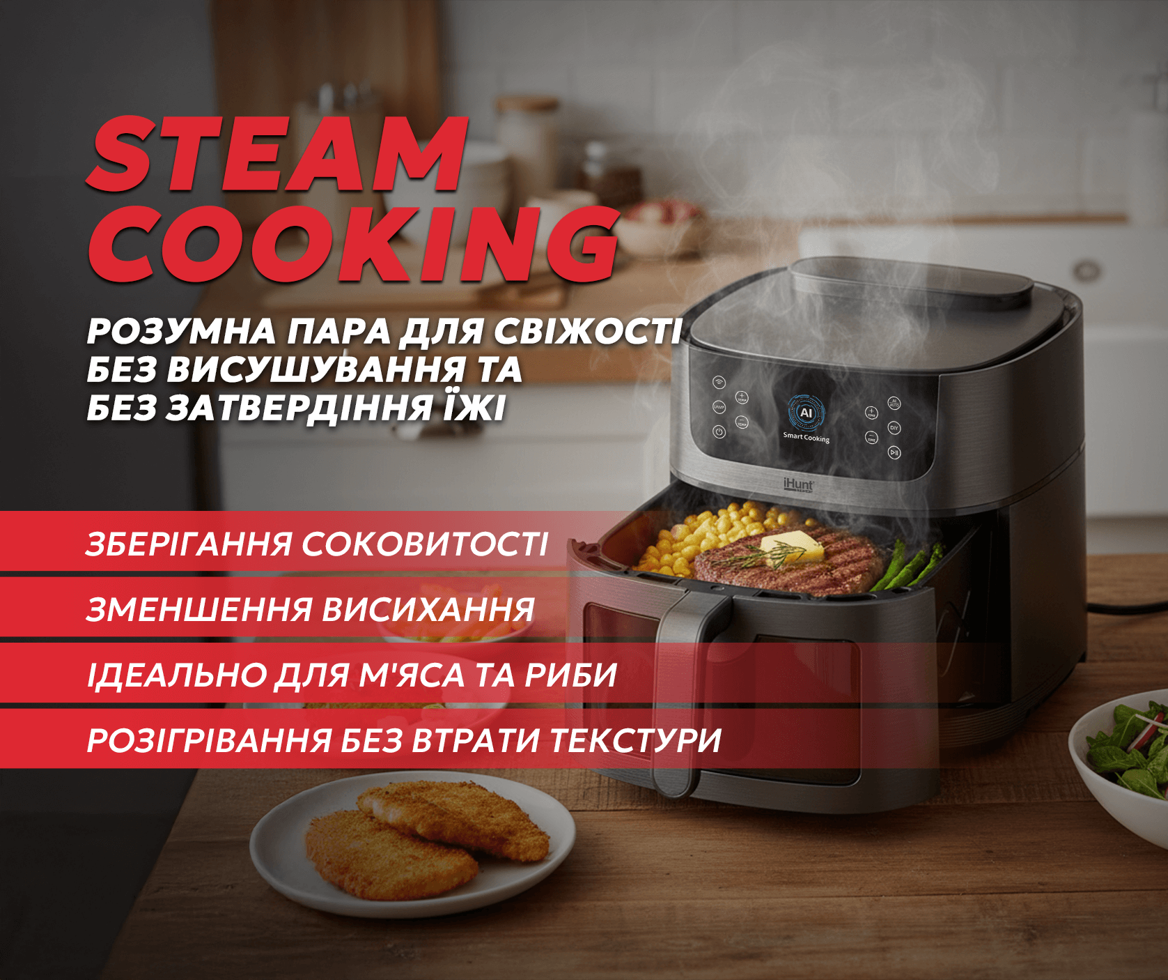 iHunt Bro Air Fryer AI Steam – це розумна фритюрниця, яка поєднує гаряче повітря з делікатним абуром для приготування здорових, ніжних і смачних страв.