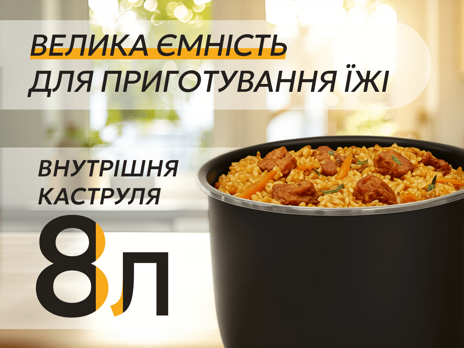 ✔ Об'єм 8 літрів — достатньо для великої родини або приготування на кілька днів