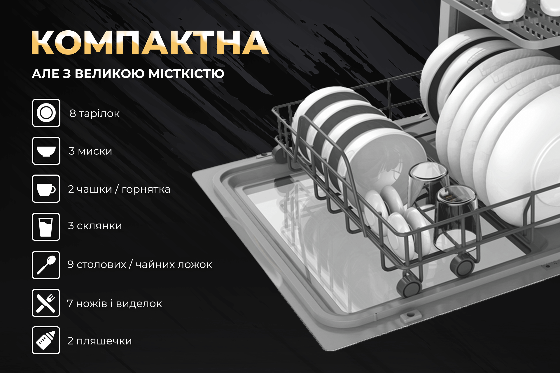 Місткість – до 3 кг посуду, ідеально для 1–2 осіб