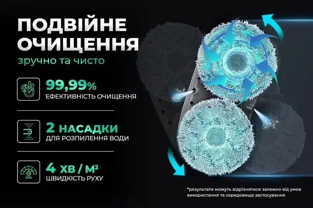 Модель обладнана двома форсунками для розпилення води, що забезпечують рівномірне зволоження поверхні перед очищенням. Такий підхід допомагає: